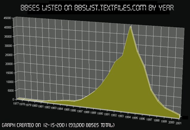 In December of 2001 I wrote a script that told me how many of the 93,000 BBSes I listed